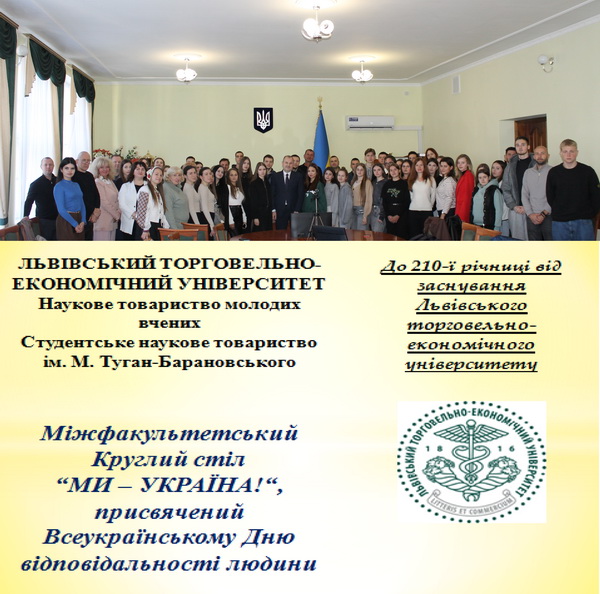 20 жовтня 2025 року з нагоди 210 річниці з часу заснування Львівського торговельно-економічного університету відбулося засідання міжфакультетського круглого столу "Ми – Україна!", присвяченого Всеукраїнському Дню відповідальності людини, яке відвідало понад 70 здобувачів закладу всіх освітніх рівнів та спеціальностей.