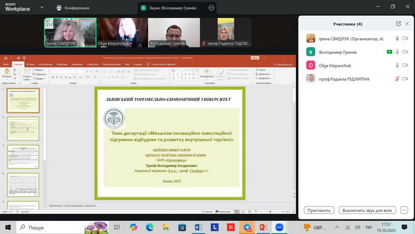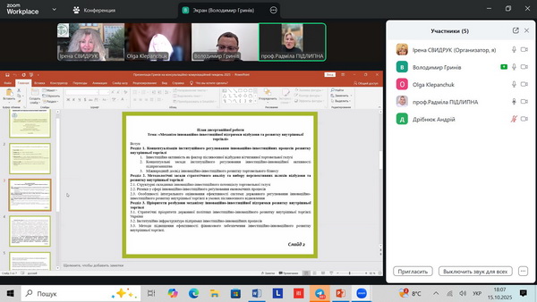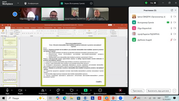 В першій такій зустрічі відбулося обговорення результатів дисертаційного дослідження на тему «Механізм інноваційно-інвестиційної підтримки відбудови та розвитку внутрішньої торгівлі» аспіранта Володимира Гриніва (науковий керівник проф. Ірена Свидрук). В обговоренні прийняли участь: Гринів В.Б., здобувач; Свидрук І.І., д.е.н., проф., науковий керівник; Міценко Н.Г. д.е.н., проф., професор кафедри економіки ЛТЕУ; Підлипна Р.П., д.е.н., проф., завідувач кафедри фінансів, обліку та оподаткування Ужгородського торговельно-економічного інституту Державного торговельно-економічного університету; Клепанчук О.Ю., д.е.н., доц., Національний лісотехнічний університет; Дрібнюк А.М., директор ТОВ «Компанія з управління активами «Роял-стандарт».