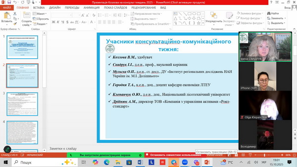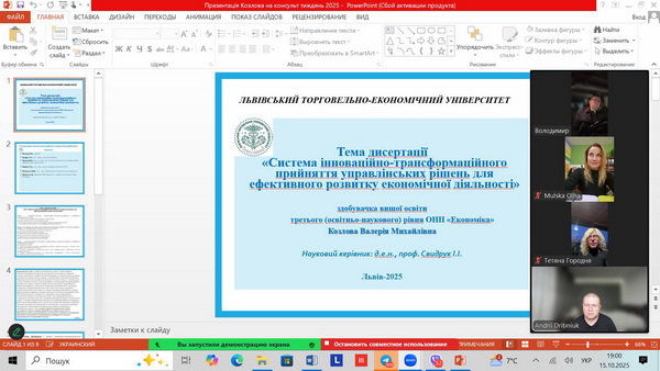 В другій зустрічі з обговорення результатів дисертаційного дослідження на тему «Система інноваційно-трансформаційного прийняття управлінських рішень для ефективного розвитку економічної діяльності» аспірантки Валерії Козлової прийняли участь: Козлова В.М., здобувачка; Свидрук І.І., д.е.н., проф., науковий керівник; Мульска О.П., д.е.н., ст. досл., ДУ «Інститут регіональних досліджень НАН України ім. М.І. Долішнього»; Городня Т.А., к.е.н., доц., доцент кафедри економіки ЛТЕУ; Клепанчук О.Ю., д.е.н., доц., Національний лісотехнічний університет та