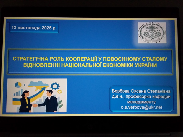 13-14 листопада 2025 р. на базі Львівського торговельно-економічного університету відбулася Всеукраїнська науково-практична конференція «Кооперативний сектор економіки України: інноваційний розвиток та європейська інтеграція». 13 листопада на другому пленарному засіданні конференції виступила д.е.н. Вербова О.С. з доповіддю: «Стратегічна роль кооперації у повоєнному сталому відновленні національної економіки України».