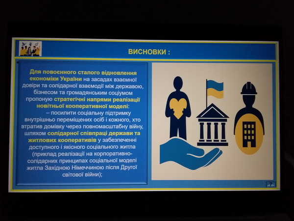 У виступі дослідниця окреслила власне бачення стратегічних напрямів реалізації новітньої кооперативної моделі для повоєнного сталого відновлення національної економіки України. Професорка кафедри менеджменту Оксана Вербова наголосила, що повоєнне стале відновлення економіки як рушійний фактор посилення національної самоідентифікації та безпеки України потребує впровадження зі збереженням тяглості національної кооперативної традиції новітньої кооперативної моделі на принципах солідарності, демократії, рівності, самоорганізації та взаємодопомоги задля добробуту теперішніх і майбутніх поколінь. Науковиця запропонувала для повоєнного сталого інклюзивного відновлення національної економіки України на засадах взаємної довіри та солідарної взаємодії між державою, бізнесом та громадянським соціумом стратегічні напрями реалізації новітньої кооперативної моделі.