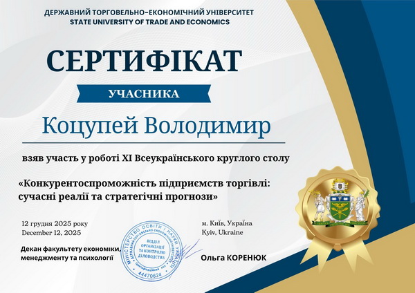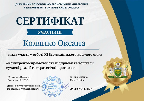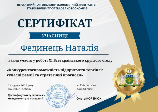 12 грудня 2025 року за ініціативи кафедри менеджменту Державний торговельно-економічний університет відбувся ХІ Всеукраїнський круглий стіл "Конкурентоспроможність підприємств торгівлі: сучасні реалії та стратегічні прогнози"