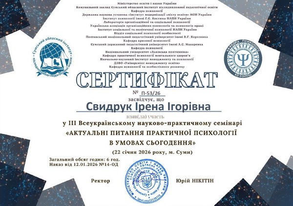 Проф. Ірена Свидрук взяла участь у у ІІІ Всеукраїнському науково-практичному «Актуальні питання практичної психології в умовах сьогодення» (на базі Сумського обласного інституту післядипломної педагогічної освіти) 22 січня 2026 р.