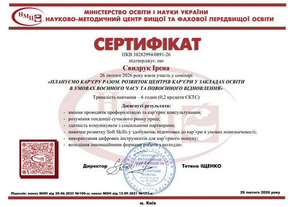 За результатами роботи проф. О. Трут та проф. І. Свидрук набули фахових компетенцій з питань професійної орієнтації та кар’єрного консультування у системі освіти України, що підтверджено Сертифікатами.